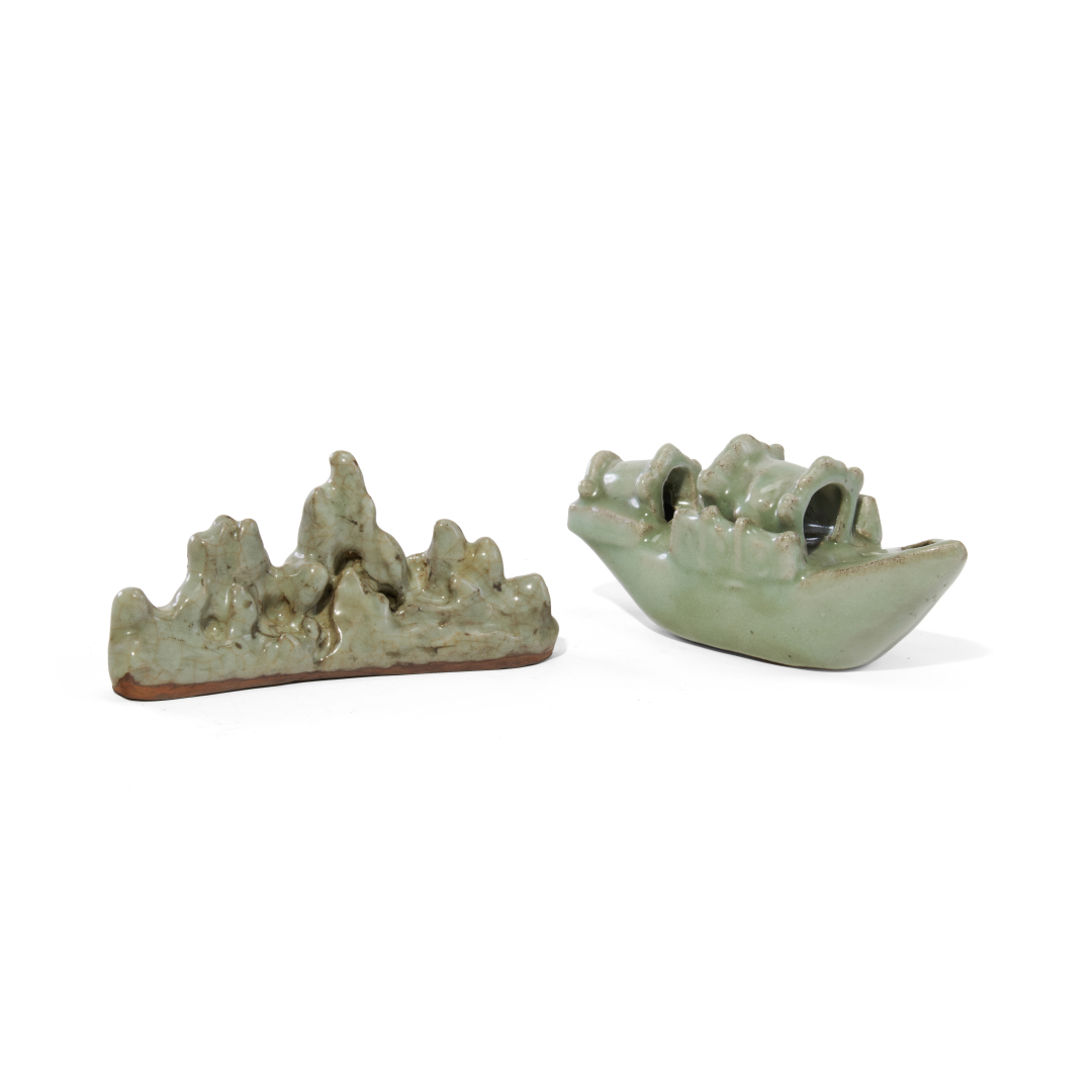 Celadon glazed ceramic, a brush rest mountain peaks-shaped and a water dropper boat-shaped.