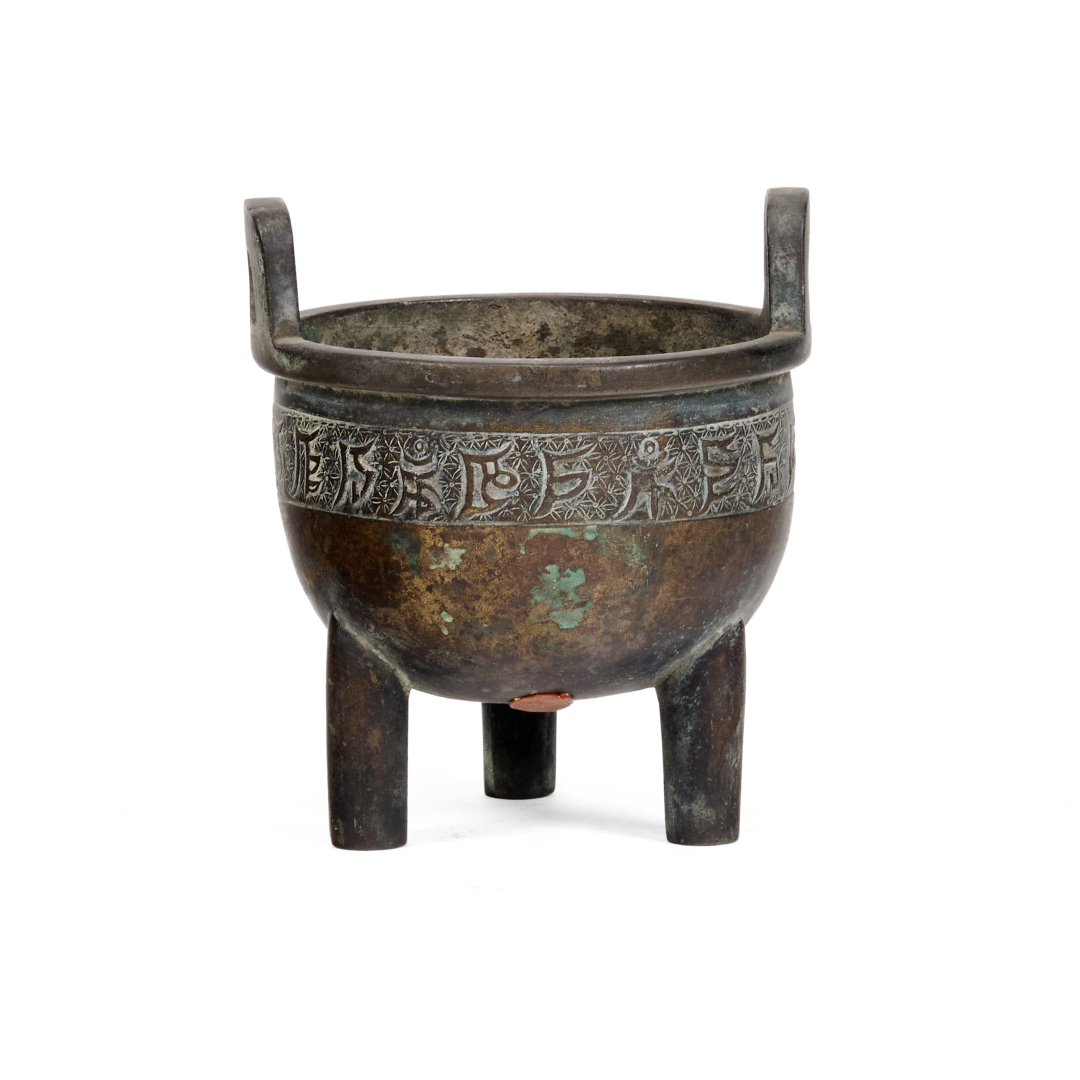 Bronze, tripod modeled on archaic dings, the upper section of the body on the outside with an inscription in Sanskrit, apocryphal Xuande mark to the center of the base.