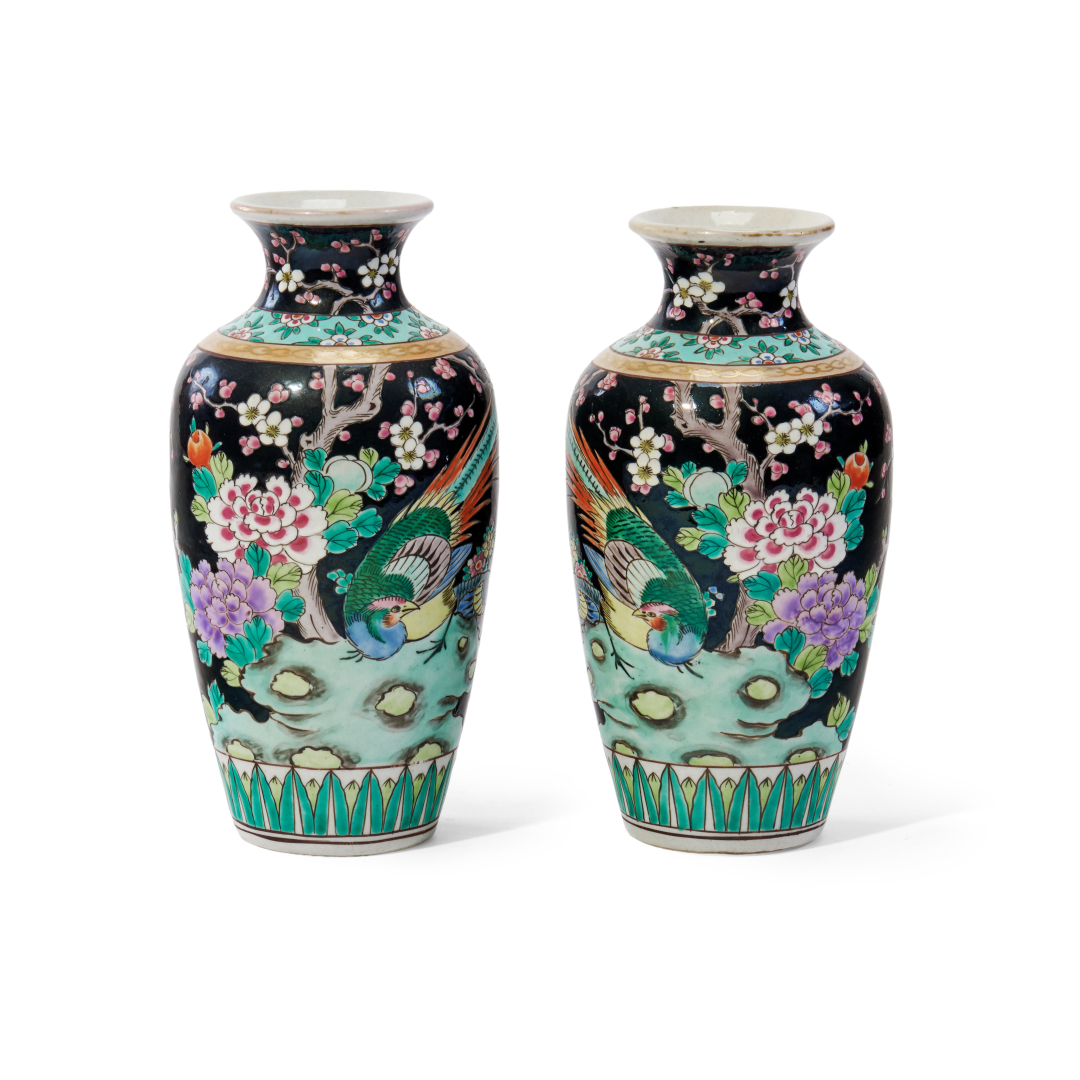 Porcelain with polychrome enamel decoration on a black ground, compositions of flowers, birds and rocks.