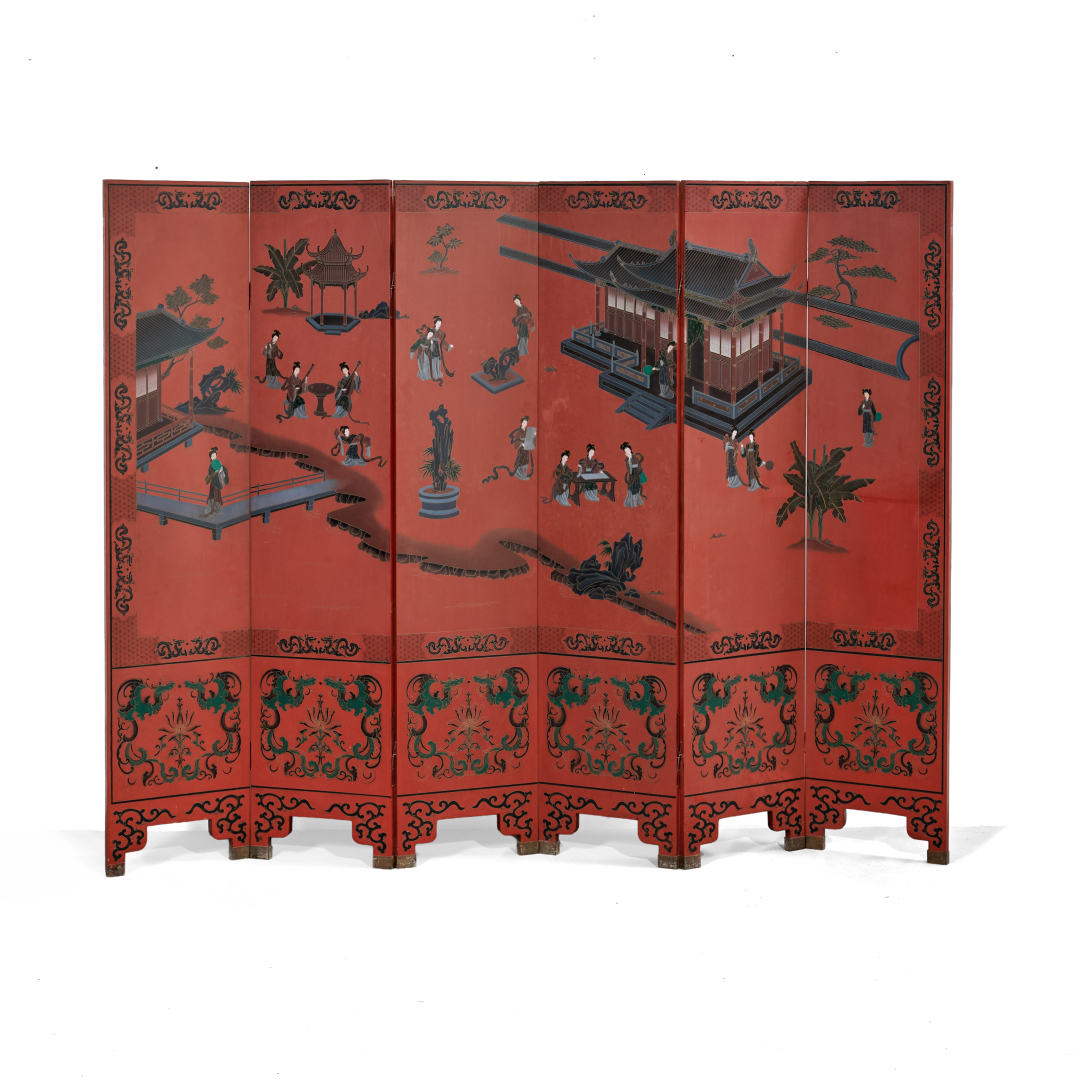 Lacquered wood with a red ground and painted in polychromy, with six panels, the main scene with ethereal female figures inside a garden with pavilions, stylised floral compositions at the bottom, scattered bunches of flowers on the back.