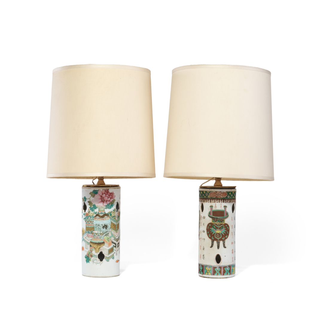 Porcelain with polychrome enamel decoration of compositions with objects and inscriptions, polylobed openings on the body of each vessel.