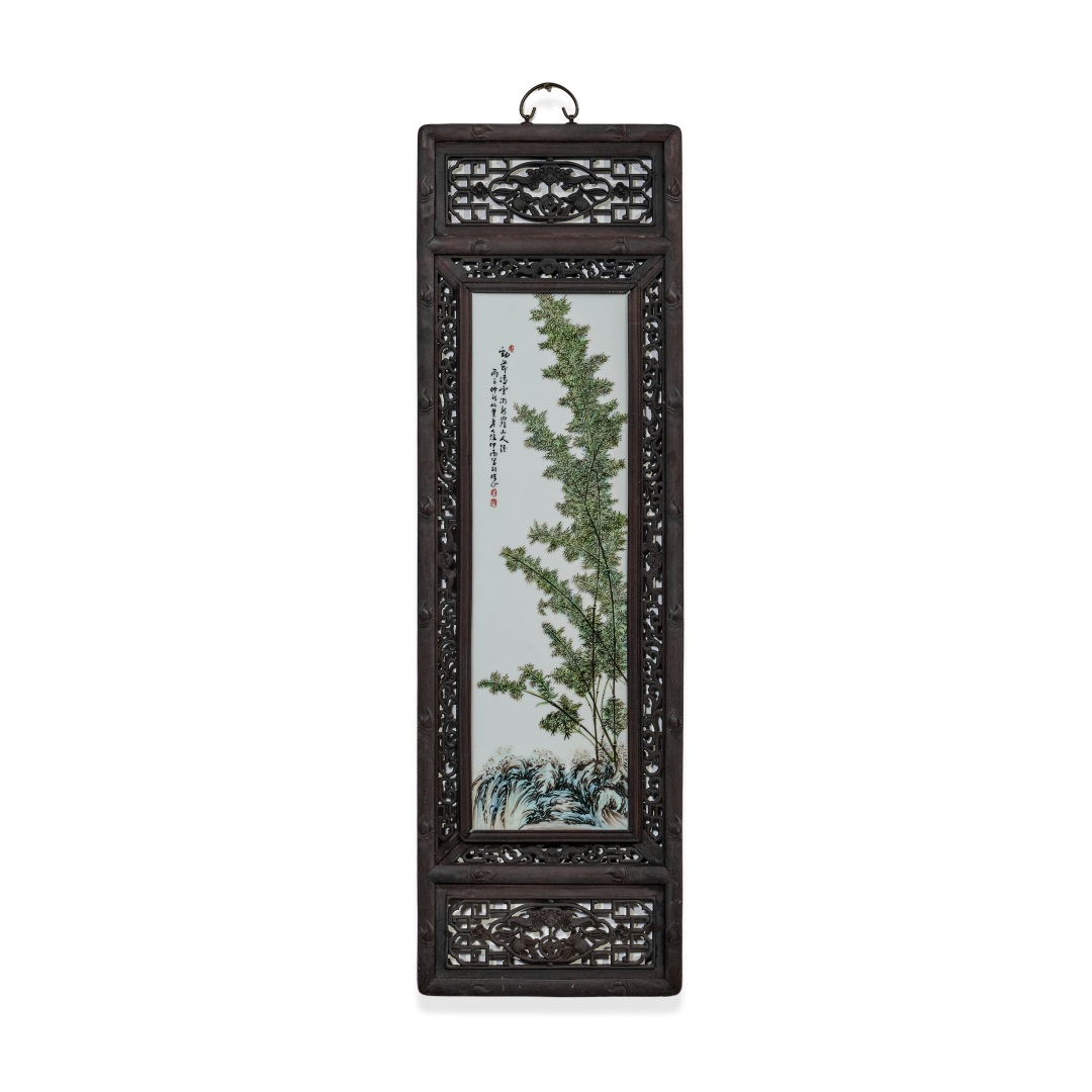 Porcelain painted with polychrome enamels, depicting a composition of trees and rocks, inscribed with a seal at the top left.