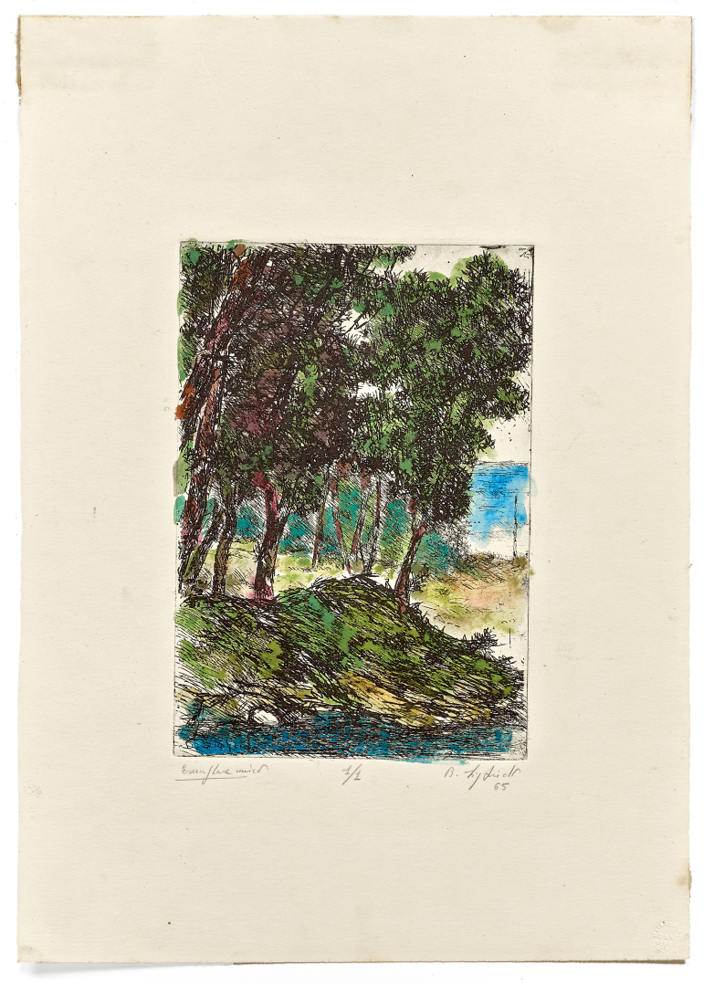 Lot completed by: Nel boschetto, 1965, etching, ed.1/1, 13.78 x 9.84 in., signed, dated and numbered lower recto, stamp Libreria Prandi, Reggio Emilia lower right recto. (3)