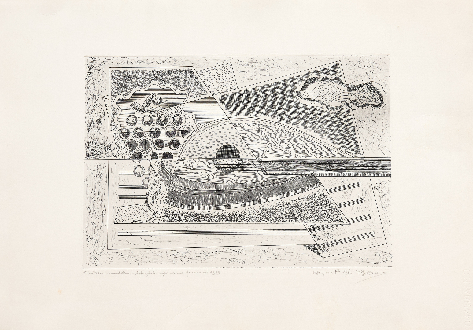 Together: Fruttiera e mandolino, etching, ed. 26/50, 27.56 x 19.49 in., signed and numbered lower right recto, on the left titled and iscription: 'Acquaforte originale dal quadro del 1929'.