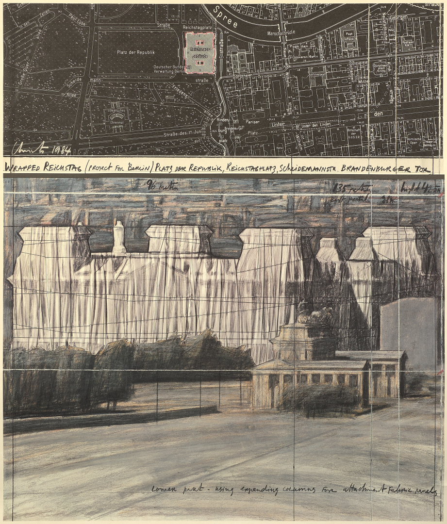 Lot completed by: Wrapped Reichstag (Project for Berlin),1984, offset printing, 31.50 x 27.17 in., signature and date printed upper left recto.