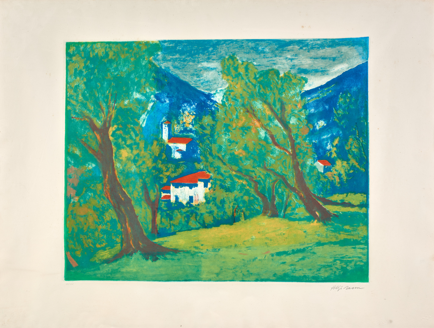 Lot completed by: Aligi Sassu, Ulivi a Zorzino, 1983,  etching and aquatint on paper, ed. 22/150, 29.53 x 39.37 in, signed lower right recto, numbered on the left.