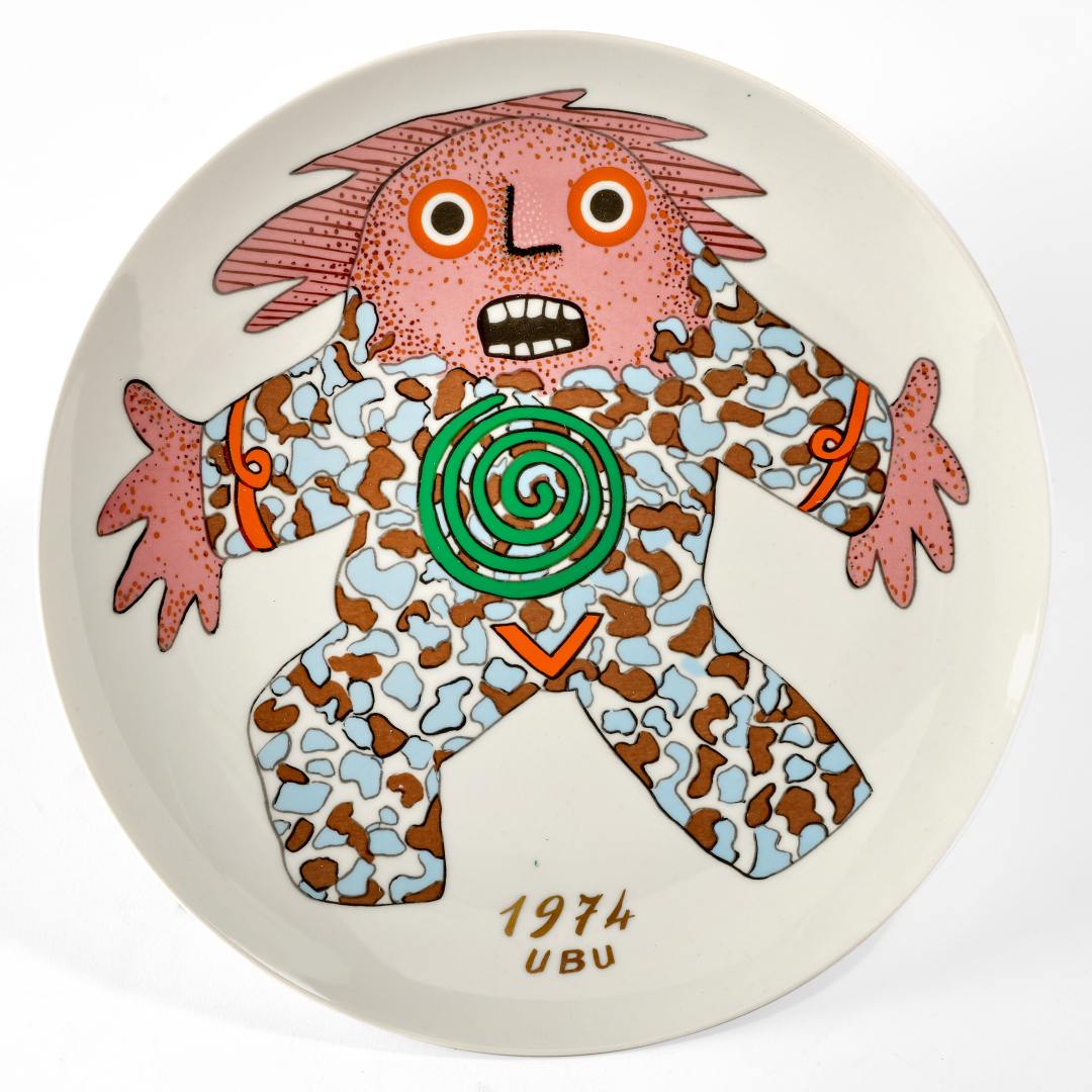 Enrico Baj, piatto dell'anno, 1974, screen-printed ceramic, ed. 60/500, 9.84 x 9.84 in., dated on recto, signed on the reverse.