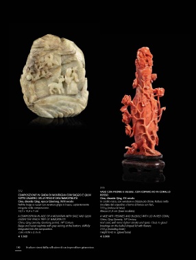 COMPOSIZIONE IN GIADA DI MONTAGNA CON SAGGIO E QILIN VASO CON PEONIE E BULBUL CON COPERCHIO IN CORALLO