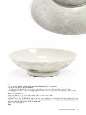 Porcellana sottile a forma di ciotola aperta su piede basso, decorata all’esterno con smalto bianco, rifinito a incisione, con fiori e foglie.