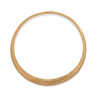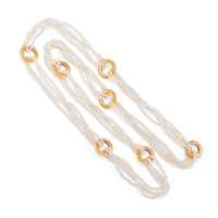 Eseguita a segmenti di perle doppio filo trattenute da grandi maglie tonde in oro giallo.