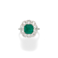 in oro bianco e smeraldo taglio rettangolare a gradini per complessivi ct. 22,00 ca. circondato da una fila di diamanti rotondi per complessivi ct 1,00 ca.