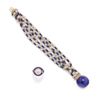 in oro giallo, formata da un bracciale torchon a cinque fili di perle intervallate da elementi in oro e smalto blu, chiusura originale a caramella eseguita in oro giallo, smalto blu e diamanti taglio huit-huit; da un anello in smalto blu,