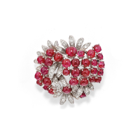 a tema floreale in oro bianco e diamanti taglio rotondo e taglio huit-huit per complessivi ct. 1,00 ca inframezzati da cabochon di rubini per complessivi ct. 4,50 ca.