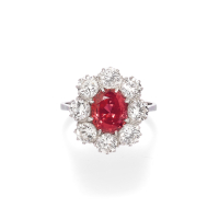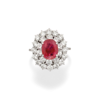 con diamanti taglio rotondo brillante di ct 3,00 ca e rubino taglio cuscino ovale di ct 3,50 ca.