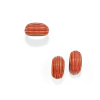 in oro giallo, realizzati mediante compenetrazione di due piani uno con corallo e l'altro con pavè di diamanti. Stile tardo decò, anni 1940-1950.