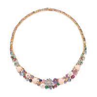 realizzata con perle, coralli, diamanti di ct 0,66 ca., smeraldi taglio cabochon di ct 1,30 ca., rubini taglio cabocon di ct 1,64 ca., zaffiri taglio cabochon di ct 1,90 ca. e varie gemme colorate come tormalina, acquamarina, topazio azzurro e