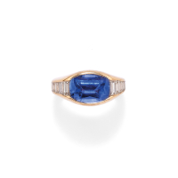 in oro giallo con zaffiro rettangolare a spigoli arrotondati di ct 5,00 ca., diamanti taglio baguette sul gambo per ct 0,75 ca. Certificato di stima della Gioielleria Cusi, Milano.