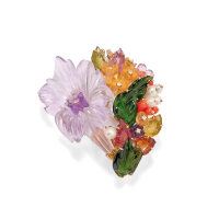 in oro giallo 14 kt e realizzata con pietre semiprezione di ametista, cromodiopside, quarzo citrino, tormalina, peridoto; con corallo e perle e diamanti taglio brillante per complessivi ct. 0,15 ca.