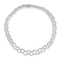 in oro bianco e diamanti composta da una collana girocollo a maglie circolari concentriche e diamanti taglio brillante rotondo moderno per un totale di ct 20,00 ca. e di una spilla a motivo di fiocco realizzata con diamanti circolari taglio