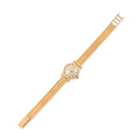 in oro giallo con cassa rotonda che racchiude un quadrante champagne con indici misti applicati (numeri arabi e a bastone) e lancette a foglia; bracciale lavorato a maglia piatta e rigata, movimento meccanico a carica manuale.