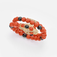 snodato realizzato con sfere di corallo e onice con, alle estremità, una testa in oro giallo lavorato, con pavè di smeraldi e diamanti e coda in oro giallo e pavè di diamanti.