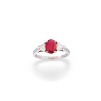 in platino iridio con due triangoli di diamanti laterali e rubino di taglio ovale di ct. 1,20 ca.