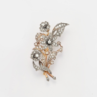 in argento e castoni in oro giallo realizzata a motivo floreale e diamanti taglio brillante rotondo e taglio rosa.