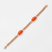 in oro giallo realizzato a maglia grumetta intervallata da due castoni ovoidali in oro giallo e corallo.