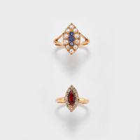 in oro giallo ed eseguiti a losanga, uno con perline di acqua dolce e zaffiri taglio rotondo e l'altro con diamanti taglio Vecchia Miniera e granato. Epoca Edoardiana, 1901/1925.