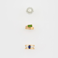 uno in oro bianco, diamanti e perla centrale; uno in oro giallo tormalina e diamanti e uno in oro giallo a doppio gambo e zaffiro ovale e diamanti taglio carré.
