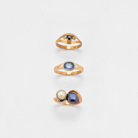 in oro giallo, uno a contrarié con perla e zaffiro; uno con zaffiro taglio ovale e due diamanti taglio rosa ed uno con zaffiro di forma ovale e due diamanti rotondi taglio brillante.
