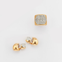 in oro giallo satinato composto da un anello con pavè di diamanti e paio di orecchini a clip a voluta con pavè di diamanti.