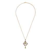 in oro 9 kt di epoca Vittoriana, con peridoti e perline scaramazza, arricchito da una collana moderna in oro.