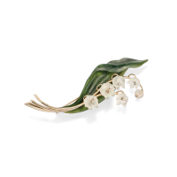 in oro bianco realizzata con fiori in pasta vitrea bianca trasparente e foglia lunga in pasta vitrea verde impreziosita da diamanti taglio huit-huit.