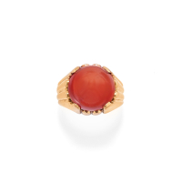 eseguito in oro giallo con gambo rastremato e grande cupola di corniola.