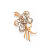 motivo floreale con diamanti taglio antico e corindone. Un diamante scheggiato.
