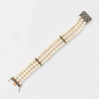 in argento dorato a tre fili di perle e pietre trasparenti a motivo floreale.