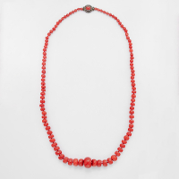 in sfere di corallo rosso martellato a barilotto a elementi digradanti con chiusura in argento dorato. Italia, fine XIX secolo.
