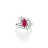 in oro bianco 18 kt con rubino ovale di ct 1,50 ca. e contorno in diamanti taglio brillante e marquise di ct 1,20 ca. Circa 1960.