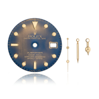 Quadrante con fondo blu virato, scritte dorate, indici in oro giallo, completo di gioco sfere.
