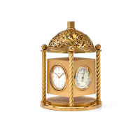 Cassa: in metallo dorato a forma di tempietto, con sommità traforata a motivi floreali e cubo sospeso ruotabile.