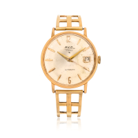 Quadrante: firmato, color champagne, indici applicati, secondi al centro, data.