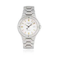 Quadrante: firmato, argentée, indici applicati, secondi al centro, data.