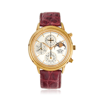 Quadrante: firmato, in smalto bianco, indici applicati, secondi continui, contatori dei 30 minuti e delle 12 ore, fasi lunari, indicazioni del