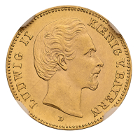 Bayern - Ludwig II (1864-1886) - 5 Marchi 1877 NGC MS 65 - Zecca: Monaco - Diritto: effigie del Re a destra - Rovescio: aquila coronata ad ali spiegate - gr. 2,00 - Cert. #8583809-008