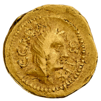Giulio Cesare - Aureo databile al 46 a.C. - Zecca: Roma - Diritto: effigie muliebre velata a destra - Rovescio: una brocca fra lituus e scure - gr. 8,01 - Rara - Ottimamente centrata, SPL