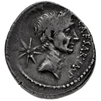 Giulio Cesare - Denario databile al 44 a.C. - Zecca: itinerante - Diritto: testa di Giulio Cesare a destra; nel campo a sinistra una stella a otto raggi - Rovescio: Venere stante a sinistra tiene una Vittoria con la mano destra e uno scettro con la sinistra, appoggiando leggi tutto