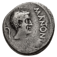 Marco Antonio - Denario al nome M.ANTON databile al 43 a.C. - Zecca: in Gallia Transalpina o Cisalpina - Diritto: testa di Marco Antonio a destra; nel campo a sinistra un lituus - Rovescio: testa laureata di Giulio Cesare a destra - gr. 3,37 - Rara - q.BB