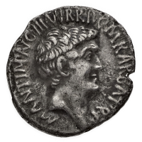 Marco Antonio e Ottaviano - Denario al nome di M.BARBAT databile al 41 a.C. - Zecca: itinerante al seguito di Marco Antonio - Diritto: testa di Marco Antonio a destra - Rovescio: testa di Ottaviano a destra - gr. 3,44 - Rara - BB