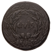 Sesterzio databile al periodo 28-15 a.C. - Zecca: incerta in Asia Minore - Diritto: testa dell'Imperatore a destra - Rovescio: lettere CA all'interno di una corona di alloro - gr. 22,98 - Rara - Uniforme patina verde scuro, q.SPL